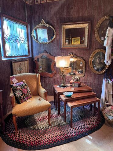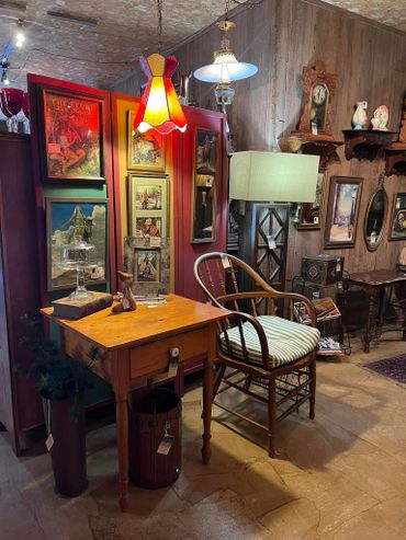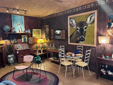 Our 3000 sq ft showroom displays an assortment of Up North cabin decor, mid-century mod furnishings, advertising stoneware, fine and costume jewelry, books and more.